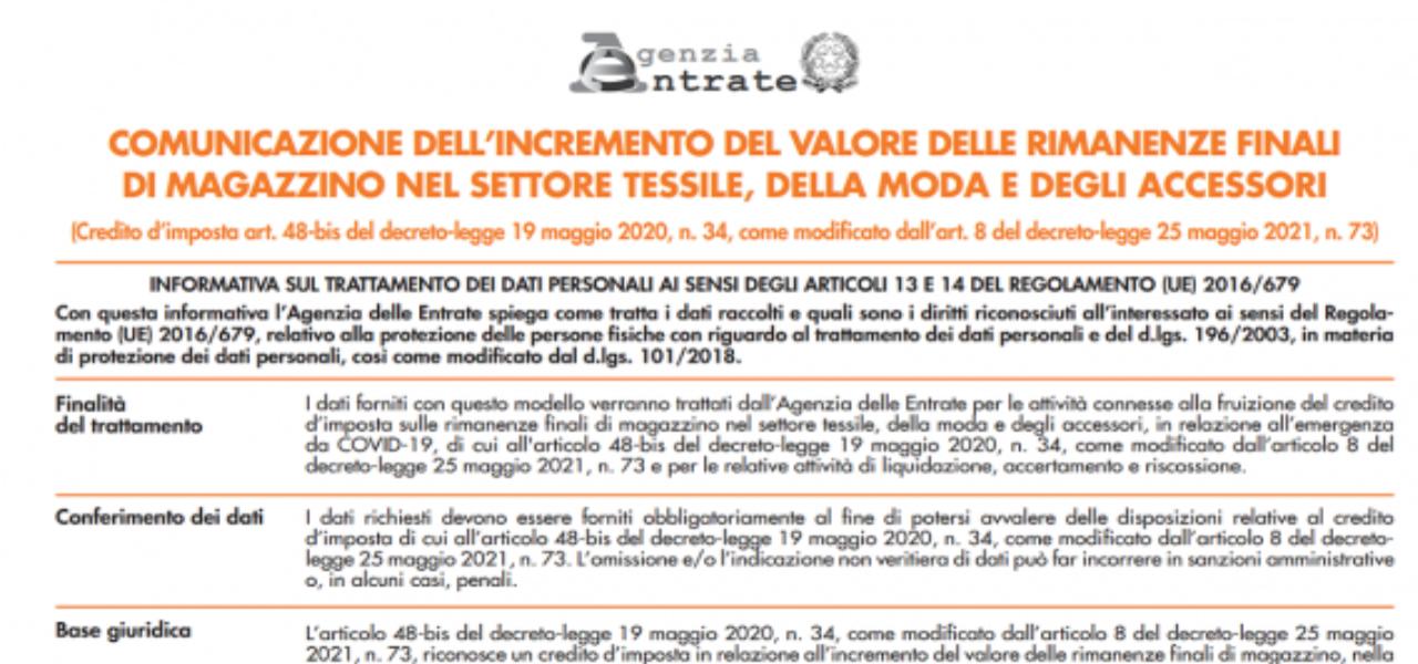Bonus moda 2022, l'Agenzia delle entrate ha pubblicato il modello per le richieste da inoltrare entro il 10 giugno 2022 per l'ottenimento del contributo del 30% sulle eccedenze di magazzino.