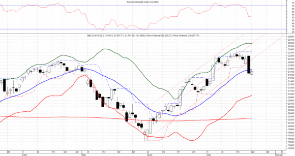 In apertura di ottava, gli investitori hanno privilegiato un approccio prudente sulla nostra Piazza Affari. Attraverso la brusca flessione fatta registrare venerdì, il livello dei corsi ha violato pericolosamente la base del sopracitato RRC: l’attuale target appare coincidente all’area di prezzo posta a 21.511,39 punti; qualora non si registrasse un vero e proprio rimbalzo (accompagnato da un incremento dei volumi), il brevissimo periodo del nostro principale listino domestico (indice Ftse Mib) vedrebbe un potenziale downside fino 20.996,89. Quest’ultimo valore potrebbe non bastare come supporto e pertanto è plausibile un suo ulteriore cedimento. Sul versante degli acquisti, in ottica di breve termine (ovvero come continuazione del trend rialzista iniziato dal mese scorso), i corsi dovrebbero recuperare il terreno finora perso e riportarsi all’interno del canale rialzista dello stesso RRC: il superamento di quota 21.994,71 punti rappresenterebbe un chiaro segnale di forza con primo target a 22.511,87.