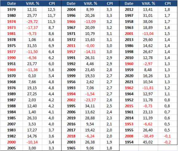Prendendo come riferimento il principale indice azionario statunitense (rif. S&P 500) e il Consumer price index (ossia la sintesi dei prezzi al dettaglio) del Bureau of Labor Statistics, si possono riscontrare numerose differenze tra l’andamento delle performance annuali del listino Usa rispetto all’ammontare dello stesso indice CPI. Di fatto, ordinando i valori di quest’ultimo in modo decrescente (dal 12,5% del 1979 fino al -0,2% del 1954), è facilmente osservabile come non ci sia una “regola fissa” nel poter dimostrare che a un incremento (anche significativo) dell’inflazione possa corrispondere una discesa delle quotazioni azionarie. Detto questo, nulla toglie che, focalizzando l’attenzione ai soli valori di CPI più elevati (quelli contraddistinti da due cifre prima della virgole) appare inconfutabile come solo in occasione dell’anno 1974 si sia registrato un saldo negativo borsistico (-29,72%) rispetto a un CPI pari all’11,5%. All’opposto, invece, nel biennio 79-80 i prezzi azionari hanno poi concluso i rispettivi anni con un incremento del 12,31% (1979) e del 25,77% (1980) nonostante valori gli elevati valori di CPI.