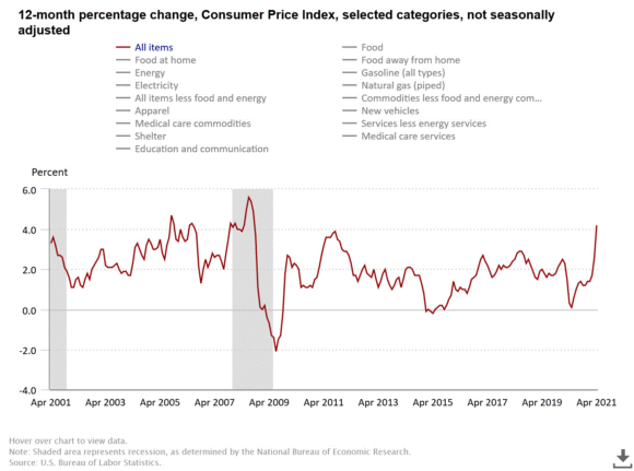 L’atteso dato relativo all’inflazione Usa è arrivato: i dati pubblicati dal Bureau of Labor Statistics hanno riportato ad aprile un +4,2% ovvero un significativo incremento rispetto al precedente valore di marzo (+2,6%). Nonostante la variazione percentuale sia la più consistente dal 2008, i mercati azionari hanno reagito diversamente alla diffusa notizia: le principali piazze del Vecchio continente hanno chiuso in positivo poco sopra la parità, mentre oltreoceano i principali indici statunitensi capitolano in territorio negativo.