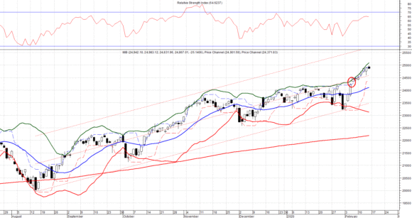 Attualmente entrambi i target rialzisti mensili sono stati raggiunti e oltrepassati e pertanto ogni movimento futuro è da ritenersi come eccesso rispetto ai limiti stimati ex ante e caratterizzati da una maggior valenza in sede operativa. Il superamento della soglia psicologica dei 25.000 punti potrebbe innescare una prima fase di vendita con target in prossimità di area 24.537,29 (II Target rialzista positivo).