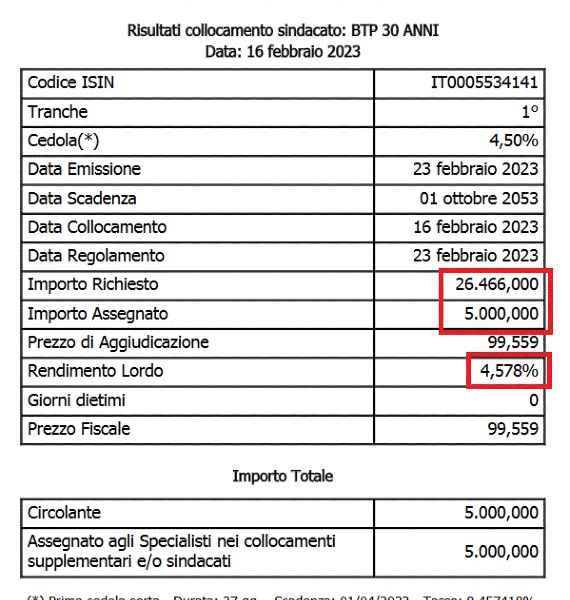 L’oggetto di questo errato giudizio (emesso da pseudo-esperti) è relativo al collocamento, che si è concluso, del nuovo Btp (benchmark) a 30 anni con scadenza 1 ottobre 2053 e cedola annua del 4,5%. Il rendimento lordo finale è stato del 4,578%: questa entità rappresenta il casus belli di tale offensiva da parte dei (lo vogliamo ripetere ancora una volta) pseudo-esperti poiché, alla base della loro obiezione, tale “ritorno” non è assolutamente in linea con il mercato. Troppo poco per una scadenza a 30 anni. Troppo poco per assumersi un rischio Paese. Troppo poco se paragonato ad altri titoli. Basta: è troppo poco. Punto.