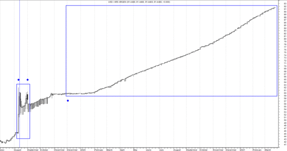 Questa nostra intuizione, a distanza di oltre un anno, può essere – nuovamente – verificata nelle attuali quotazioni: il rapporto Usd/Try (Dollaro Usa/Lira turca) è passato da 5,275 (novembre 2018) ad un massimo di poco superiore a 8,50 (novembre 2020). Seguendo la medesima ratio della nostra precedente analisi (ovvero la moneta turca quale driver anticipatorio nei confronti della valuta argentina), si può chiaramente osservare come il Peso argentino (cross Dollaro Usa/Peso argentino) – da novembre 2019 ai giorni nostri – abbia incrementato il proprio valore (da 59 a 92) in maniera costante e registrando verosimilmente la stessa rivalutazione del suo contrapposto benchmark (Lira turca): circa sessanta punti percentuali.