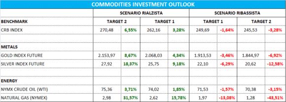 Le materie prime rappresentate dal CRB Index vedono le attuali quotazioni ritornare ai livelli di febbraio 2022. Graficamente, il perdurare dei prezzi in concomitanza di soglia 255 punti non favorisce un posizionamento in chiave strategica poiché, in caso di eventuale ritracciamento (inferiore a quota 254,032 punti), il potenziale approdo vedrebbe una destinazione ben oltre i 250 punti (rif. target II livello ribassista). Positivo, invece, il superamento (già in questa ottava) del primo obiettivo rialzista mensile: se ciò dovesse accadere, il successivo target (secondo livello) oltre 270 punti, vedrebbe una concreta realizzazione nel corso delle prossime ottave. Al momento, seppur limitata, viene confermata la nostra precedente view a favore del solo basket metals non preziosi (nickel e rame).