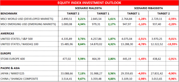 Sul listino statunitense S&P 500 si può ipotizzare un approdo in area 4.325 punti, mentre un potenziale scenario di inversione potrebbe giungere con il ripiegamento delle quotazioni oltre quota 4.179 punti. In Europa, l’indice Stoxx 600 dovrà oltrepassare quota 470,45 punti per poter soddisfare una migliore impostazione dal punto di vista algoritmico: oggi, infatti, solo i più reattivi leading indicators riportano buy signals, mentre sul contrapposto bacino dei lagging indicators risultano ancora valori di non chiara direzionalità. All’area “Pacif & Asia” potrebbe subentrare (quale alternativa) un primo posizionamento sul paniere Emerging Markets che, ancora penalizzato da inizio anno, beneficerebbe di un possibile ritorno di interesse.