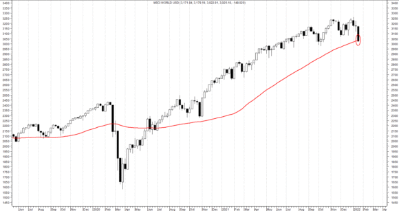 A confermare quest’ultimo malaugurato scenario, giunge prontamente il grafico settimanale del benchmark azionario MSCI World Usd che, anch’esso raffrontato alla propria media mobile a 50 osservazioni, vede confermare l’ormai prossima violazione della medesima soglia di alert.