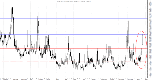 Da fine 2021 “l’indice della paura” ha registrato una rivalutazione significativa non solo dal punto di vista assoluto (dai 17,22 punti agli attuali valori), bensì in termini relativi ovvero l’arco temporale impiegato: 14 giorni. Qualora l’instabilità dei mercati finanziari non trovasse “pace” già nel corso di questa settimana, il timore potrebbe equivalere a nuovi massimi ben oltre la soglia raggiunta lo scorso dicembre (area 35 punti).