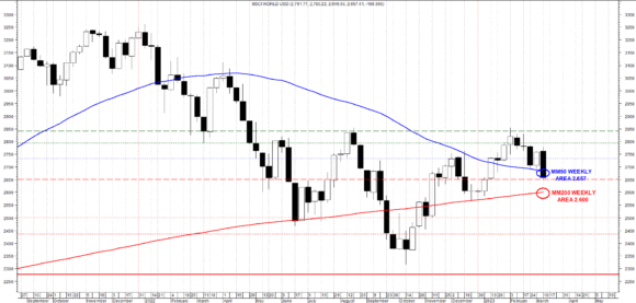 Guardando al consueto MSCI World Usd risulta evidente la fragilità di fondo che caratterizza l’attuale momento: la scorsa chiusura weekly ha violato l’importante soglia rappresentata dal transito della media mobile a 50 osservazioni settimanali e un’eventuale prosecuzione del trend ribassista in atto vedrebbe l’imminente approdo in area 2.600 punti coincidente alla media mobile a 200. Qualora si arrivasse a quest’ultimo livello attraverso poche sedute (non oltre la settimana), l’intero versante algoritmico subirebbe una veloce inversione di tendenza (ora già debole e orientata alla negatività) con un pressoché generalizzato sell signal. Nel brevissimo periodo viene individuata quota 2.633,79 punti quale possibile arresto che, se confermato, favorirebbe il ritorno degli acquisti con successivo target a 2.690,32. Da segnalare la presa di profitto sull’indice nipponico Nikkey 225 che, beneficiando del recente upside, ha conseguito il precedente target rialzista individuato a febbraio.
