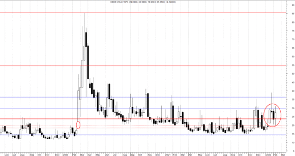 A meglio rappresentare l’attuale stato dei mercati finanziari è sufficiente soffermare l’attenzione su due grafici tra loro correlati. Il primo è quello relativo all’indice Vix dove è facilmente riscontrabile una sua fase di lateralità caratterizzata da consistenti valori (ben al di sopra della consueta media): da inizio anno, infatti, con eccezione per la prima seduta settimanale, si possono osservare quattro sessioni weekly consecutive distinguibili per il loro ampio ATR (Average True Range) compreso tra i 21 ed i 29 punti; escludendo volutamente gli eccessi oltre quest’ultimi valori, si può correttamente ipotizzare come l’area indicata circoscrivibile a 8 punti, possa realmente definire i prossimi scenari di brevissimo periodo ovvero: un ritorno in prossimità di quota 29 agevolerebbe un potenziale superamento con target in direzione di soglia 33,10 punti. Viceversa, qualora dovessimo assistere ad un veloce ripiegamento in area 23,25 punti, una successiva prosecuzione del downside favorirebbe un primo allentamento dell’incertezza con buone probabilità di poter osservare un ritorno sotto i 18 punti.