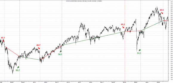 Accantonando la teoria, abbiamo ritenuto opportuno “verificare sul mercato”, l’effettiva validità operativa dell’indice finora trattato e, comparando la serie storica (2008-2022) dell’indice PMI Composite (rif. Eurozona) con il benchmark azionario Eurostoxx 600, la sintesi che ne consegue è contrastante.