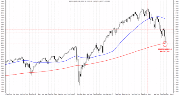 Passando ai principali benchmark internazionali da noi adottati, la certezza che emerge e può essere riscontrata mediante il recente andamento dei prezzi, arriva dal fronte azionario. In quest’ultima ottava, il consueto sottostante MSCI World Usd, ha raggiunto e violato la temuta media mobile a 200 osservazioni settimanali che, da un mese, veniva indicata come «naturale» e coincidente al «primo target ribassista in ottica di breve termine».