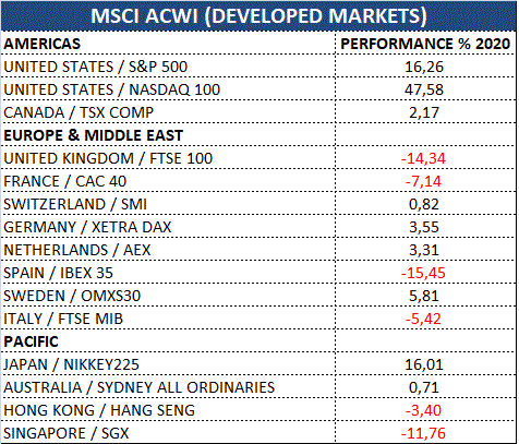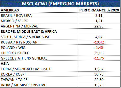 Il brindisi di fine anno non è stato assaporato da molte borse internazionali. Le perfomance azionarie nel corso dell’indimenticabile 2020 hanno evidenziato record storici su alcuni listini e, allo stesso tempo, una selettiva distribuzione geografica dei risultati conseguiti. Analizzando la principale macro-segmentazione rappresentata dai benchmark MSCI emerge il prevalere della componente emerging rispetto a quella developed.