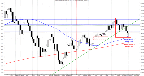 Il citato e principale aspetto tecnico riconducibile al comparto azionario è pressoché giunto a un punto crociale. Monitorando il consueto benchmark MSCI World Usd, è facilmente individuabile il conseguimento del menzionato (al termine di settembre) punto di approdo rappresentato dalla violazione della media mobile a 50 osservazioni settimanali.