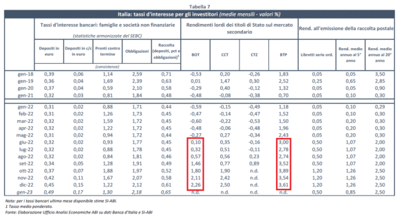 A sintetizzare questo complessivo stravolgimento del “mercato dei rendimenti” ci può essere di aiuto il recente rapporto redatto da ABI (rif. Monthly Outlook di gennaio) che, nella sua sezione dedicata alla raccolta bancaria, riporta “In aumento il Rendistato e i titoli pubblici”: «Nel mese di dicembre 2022 il rendimento lordo sul mercato secondario dei CCT è risultato pari a 2,50% (2,42% il mese precedente e -0,21% un anno prima). Con riferimento ai Btp, il rendimento medio è risultato pari a 3,61% (3,55% il mese precedente; 0,93% un anno prima). Il rendimento medio lordo annualizzato dei Bot, infine, è passato nel periodo dicembre 2021-dicembre 2022 da -0,63% a 2,26%».