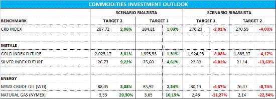 Al momento, appare difficile una prosecuzione dell’attuale trend rialzista e, pertanto, qualora le quotazioni dovessero approssimarsi (e non coincidere) alla soglia indicata ne suggeriamo la liquidazione. Di fatto, tale prudenziale scelta, è subordinata all’ormai troppo vicina area di potenziale inversione ribassista che possiamo collocare a 282 punti: qualora si dovesse assistere ad una chiusura inferiore è plausibile una prosecuzione del downside in direzione di quota 279,187 punti. Osservando i rispettivi basket rimaniamo attendisti sull’intero paniere metals (sia “preziosi” che “non preziosi”) poiché, attualmente, sembrano essere inficiati da un significativo peggioramento sia tecnico che algoritmico. Viceversa, sul contrapposto comparto energy, rimaniamo convinti della bontà riconducibile a un possibile posizionamento (long) su RBob Gasoline, ma, adesso, solamente in caso di superamento di area 2,735. Da segnalare, inoltre, una possibile rottura (rialzista) sull’heating oil con ordine di acquisto a 333,75 ed un primo obiettivo a 341,05.
