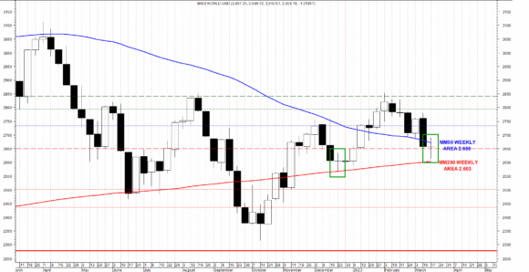 Parallelamente alla criticità illustrata sull’indice Vix, anche la rispettiva asset class equity (rif. MSCI World Usd) riporta graficamente la sintesi dell’attuale momento: infatti, come già accaduto al termine dello scorso dicembre, l’ultima configurazione grafica settimanale in formato candlestick pone l’accento sull’equilibrio (ovvero l’incertezza) tra compratori e venditori mediante una cosiddetta “Dojy Star”.