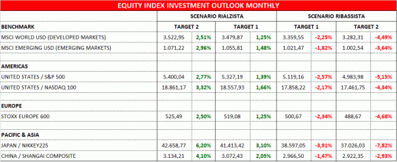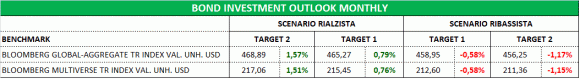A possibile conferma di questa serenità, ci viene in aiuto il monitoraggio del consueto indice MOVE che, giunto a quota 86,38 punti, rivede i livelli del Febbraio 2022 confermando, quindi, i nostri precedenti auspici. Beneficiando di questo stallo in capo alla politica monetaria riteniamo, coerentemente, vantaggioso il posizionamento in chiave strategica sull’intera asset class obbligazionaria con un attuale limite di prezzo non superiore ad area 462,10 punti.
