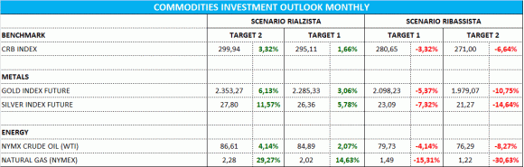 Da sottolineare come, antecedentemente a questa potenziale dinamica, potremmo, comunque, assistere un nuovo massimo (291,148 punti). Nei singoli basket viene rilevata l’eccellente performance dell’oro che, in chiave tattica, viene però accantonato preferendo il suo più vicino sottostante (rif. argento). Sul comparto metalli non preziosi, invece, l’alluminio edil rame sembrano poter essere oggetti a un potenziale incremento di volatilità: prudenza, pertanto, per coloro che detenessero posizioni in portafoglio. Nel contrapposto insieme energy, seppur anticipata, una iniziale strategia long di ampio respiro può essere costruita sul gas naturale. Ancora attesa, invece, sul tradizionale oro nero (rif. petrolio Wti).