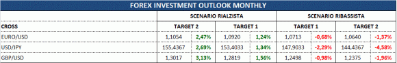 In ambito valutario, per il mese in corso, suggeriamo il monitoraggio del principale cross valutario Eur/Usd che, in caso di cedimento di area 1,076 ritroverebbe un primo approdo a quota 1,0618 con plausibili e ulteriori implicazioni negative in direzione dei minimi dello scorso ottobre. Guardando ai restanti rapporti, al momento, privilegiamo l’attesa.