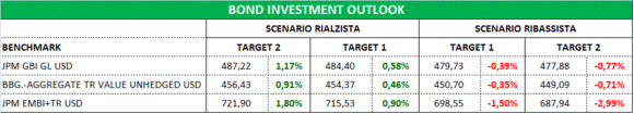 Al buon esito dei mercati azionari internazionali non coincide la medesima tendenza della contrapposta compagine obbligazionaria (rif. JPM GBI Gl. Usd) che, invece, archivia la terza candela nera mensile consecutiva. Quest’ultimo trimestre dell’anno vede particolarmente penalizzata l’asset class bond governativa e non si può escludere una scarsa attrattività per i prossimi mesi. Le risultanze finora emerse dai governatori delle banche centrali (rif. Fed e Bce) durante il recente incontro a Sintra sembrano decretare una probabile instabilità sull’intero comparto; inoltre, nel medio termine, a causa delle paventate incognite sui futuri rialzi dei tassi di interesse si potrebbe precludere un potenziale e significativo upside dei corsi con, inevitabilmente, l’insorgere di una disaffezione tra gli investitori.
