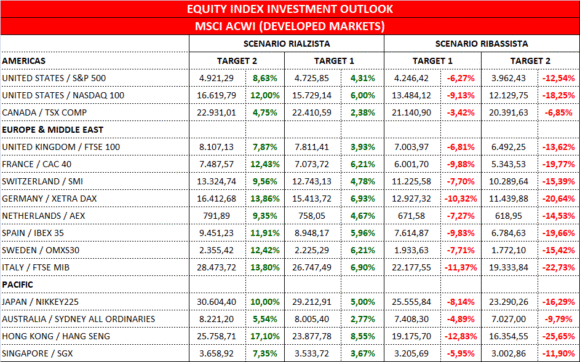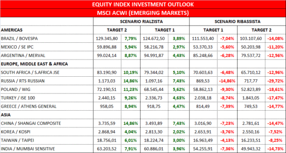 Sulla componente equity (rif. MSCI World Usd) appare fondamentale la tenuto del supporto statico posto a quota 3.012,71 che, se violato, consentirebbe un’accelerazione ribassista con primo obiettivo a 2.896,89 punti. Attualmente, in chiave rialzista, non può essere escluso un ulteriore allungo con primo step oltre i 3.199,79 punti.