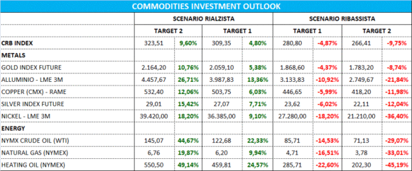 A una view neutrale sui mercati azionari viene tratteggiata un’ipotesi di consolidamento rialzista – in ottica di brevissimo termine – sulla classe di investimento obbligazionaria (rif. JPM GBI Gl. Usd): pur consapevoli di operare contro-trend (la tendenza primaria è ribassista, ndr) l’eventuale superamento di area 542,99 punti favorirebbe un successivo incremento con primo obiettivo corrispondente a soglia 545,30 punti. Difficile, invece, ipotizzare una fase di consolidamento laterale dei corsi qualora i prezzi dovessero riportarsi nuovamente in prossimità di soglia 536,07: la violazione di quest’ultima sarebbe pressoché certa con inevitabili nuovi minimi di anno.