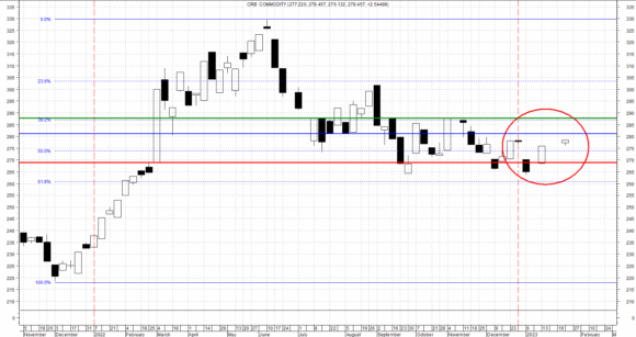Le commodities, sintetizzate dal benchmark CRB Index, appaiono traguardare a un bivio tecnico: le recenti quotazioni si sono caratterizzate per una discontinuità giornaliera (rif. numerosi gap su base intraday) che, operativamente, rappresenta l’anticipazione di un forte movimento direzionale. La scorsa chiusura settimanale conferma questa ipotesi e gli attuali livelli di prezzo pongono lo stesso CRB Index a metà strada tra i rispettivi obiettivi: rialzista a 287,71 e ribassista a quota 268,99 punti. L’evoluzione delle prossime quotazioni decreteranno la direzione finale e, fin da ora, se ne suggerisce il monitoraggio soprattutto in caso di cedimento di area 272,919 punti.