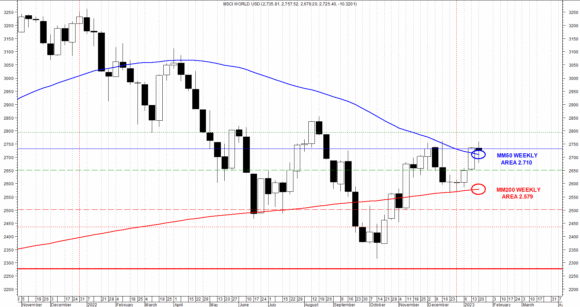 Subito un veloce sguardo agli andamenti: bond e commodities hanno terminato la loro sessione settimanale con un progresso di poco inferiore all’unità, mentre, l’equity ha concluso in lieve territorio negativo. Quest’ultima, da noi sintetizzata attraverso il consueto MSCI World Usd, ha pressoché testato il precedente scenario ribassista arrestando anticipatamente la propria corsa per successivamente riportarsi a ridosso della media mobile a 50 osservazioni weekly: al momento, quest’ultima area di transito (2.710 punti), rappresenta il principale supporto che, in caso di violazione, agevolerebbe l’iniziale creazione di un potenziale trend ribassista di breve termine con target in corrispondenza della già citata soglia dei 2.650,42 punti.