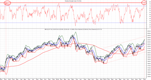 Graficamente la dinamica dei prezzi evidenzia un importante gap up identificabile tra 22.946,01 e 23.027,49 punti: quest’ultima area rappresenta il primo obiettivo in chiave ribassista qualora si violasse il supporto a 23.294,52. L’attuale obiettivo rialzista è rappresentato dalla resistenza a 23.680,22 punti: un fisiologico ribasso appare plausibile qualora fosse superata senza conferma mediante una chiusura (superiore alla medesima resistenza). Da sottolineare i valori raggiunti dal più comune e utilizzato indice di forza relativa denominato RSI (Relative Strength Index): impostato a 14 giorni evidenzia soglie di ipercomprato che ci riportano al lontano dicembre 2016. Per tale rilevazione è suggerito un approccio prudente in ottica di brevissimo periodo.