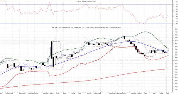 Per tale dinamica, il principale benchmark obbligazionario JPM GBI Gl. Usd ha visto nuovamente i propri corsi prima in prossimità di area 595 punti per successivamente ripiegare in chiusura di ottava a quota 592,62 ovvero poco sotto la resistenza individuata e riconducibile al trading range in precedenza definito.