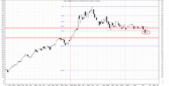 Causa il calo di fiducia sui mercati finanziari solo sul finire di ottava, le principali asset class equity, bond e commodities, registrano comunque un saldo complessivo settimanale positivo. La componente azionaria circoscrivibile al consueto MSCI World Usd, dopo aver oltrepassato l’importante transito (2.656 punti) della media mobile a 50 osservazioni weekly ha diretto i propri corsi in direzione del nostro precedente prezzo indicato (2.690 punti) oltrepassandolo con slancio fino a giungere a quota 2.743,37 (massimi di ottava). Successivamente, complice l’inasprirsi dell’attuale crisi in essere sul mondo bancario, ha visto ridimensionare il livello delle quotazioni terminando la sessione a 2.692,55 punti ossia poco sopra l’indicata media mobile che, ora, transita in area 2.665 punti.