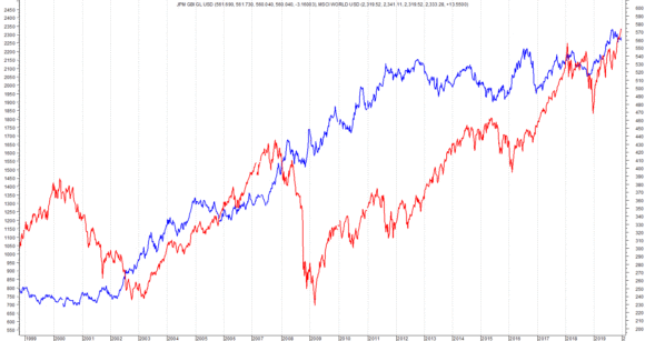 E ora spetta la valutazione delle performance acquisite nel corso del tempo dalle due “contrapposte” asset class. Dal 1999 a oggi, il benchmark azionario MSCI World Usd ha raddoppiato il proprio valore passando da un livello di prezzo di area 1.150 all’attuale soglia di 2.300 punti. Risultanze analoghe ma, contraddistinte da un maggior incremento, quelle riconducibili al JPM GBI: dai 250 punti del lontano 1999 si è giunti alle attuali quotazioni in area 560 (+124%).