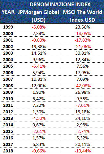 Da tale comparazione, le risultanze emerse non giustificano – attraverso i risultati acquisiti – la bontà dei precedenti presupposti ritenuti fondamentali nella gestione degli investimenti. Sintetizzando sul versante della correlazione (o decorrelazione): dal 1999 al 2018 (escludiamo volutamente l’anno corrente perché ancora in corso) si possono rilevare solo 7 anni (1999, 2000, 2002, 2005, 2008, 2011 e 2013) in cui si è registrata un’effettiva correlazione negativa. In questi singoli archi temporali, all’aumentare dell’uno è conseguito parallelamente la diminuzione dell’altro. In tale rapporto inversamente proporzionale, l’elemento significativo che deve far riflettere, è ricondotto all’entità della perdita (o guadagno) potenzialmente accusata. Nel corso di questi 7 anni, a un incremento dell’indice MSCI World Usd, ha fatto da contrappeso una somma di performance negative di circa 16 punti percentuali (-15,99%) per la componente bond. All’opposto ovvero soffermandoci alla casistica che vede l’indice JPM GBI primeggiare positivamente nei confronti della componente azionaria – quest’ultima – ha accusato una flessione (quale sommatoria dei singoli saldi negativi fatti registrare in ciascun anno) di poco inferiore all’85% (-84,80%).