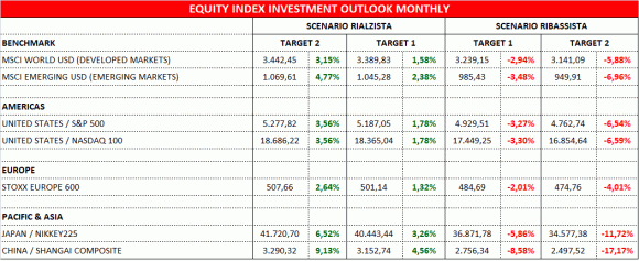Beneficiando di questo potenziale “clima di certezza” sul futuro della politica monetaria internazionale, i mercati azionari hanno potuto continuare indisturbati aggiornando i precedenti massimi: nuovi record per i due listini a stelle e strisce S&P 500 e Nasdaq 100 così come per il principale indice europeo Stoxx 600. Anche in Asia, il nipponico Nikkey 225 ha potuto festeggiare mancando di poco la soglia psicologica dei 40.000 punti. Conseguentemente a questo rialzo generalizzato, il consueto benchmark MSCI World Usd rappresentativo della componente azionaria ha potuto proseguire la propria corsa che, ormai giunto oltre area 3.364 punti, ha, di fatto, violato la parte superiore del canale rialzista da noi in precedenza evidenziato.