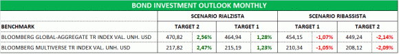Sulla contrapposta asset class obbligazionaria, l’indice Bloomberg Global-Aggregate Total Return Index Value Unhedged Usd sta confermando le nostre attese e l’ottava che si conclusa ha visto il secondo segno positivo consecutivo su base weekly.