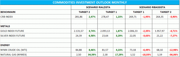 Graficamente, quota 278,99 punti circoscrive l’area di prezzo quale primario obiettivo rialzista che, se conseguito, agevolerebbe un ulteriore allungo oltre soglia 281,885. Negativo, invece, il cedimento di area 270,75 punti che, se realizzato nell’arco di una sola sessione settimanale, alimenterebbe la forza dei venditori con plausibili pressioni fino a 266,953 punti. Sui singoli basket privilegiamo il paniere metals con l’oro preferito all’argento e i restanti rame e nickel ritenuti più interessanti rispetto all’alluminio. Grosso punto interrogativo, invece, sul comparto energy, dove il gas naturale, pur oggetto di maggiore volatilità, potrebbe beneficiare di un ritrovato interesse in ottica rialzista.