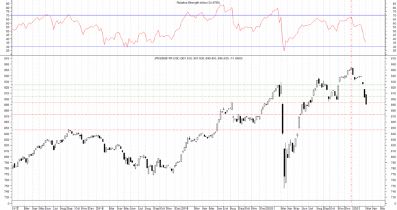 Già a inizio anno l’analisi quantitativa mostrava una componente obbligazionaria (rif. JPM GBI Gl. Usd) come «maggiormente penalizzata sulla base del rapporto rischio/rendimento associato». Successivamente, con il trascorrere delle settimane, l’intero quadro tecnico andava via via peggiorando fino all’attuale significativo epilogo (momentaneo) che evidenzia saldi da inizio anno in pesante flessione. Un dato su tutti: -6,678% la variazione YTD (year to date) dall’indice JPM EMBI+ Usd rappresentativo dell’asset class obbligazionaria dei Paesi emergenti. Di diversa entità – ma pur sempre rilevante – la minusvalenza in corso di 2021 sull’indice JPM GBI Gl. Usd che vede una flessione di oltre quattro punti percentuali.
