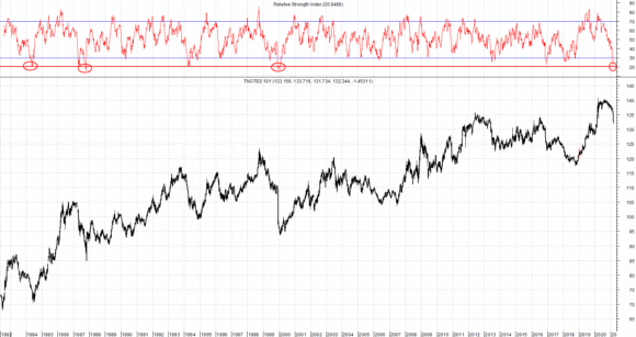 Per poter rappresentare l’attuale “eccesso” abbiamo cercato un possibile riscontro oggettivo nella storia (arco temporale 1982-2021). Comparando la serie dei prezzi del decennale Usa e il più comune indicatore di forza relativa RSI (a 14 rilevazioni) si può osservare – con timeframe weekly – come l’attuale ipervenduto (area 20 punti) si sia verificato solo in tre occasioni: nel maggio 1984, nell’ottobre 1987 e nel bimestre dicembre 1999 e gennaio 2000.