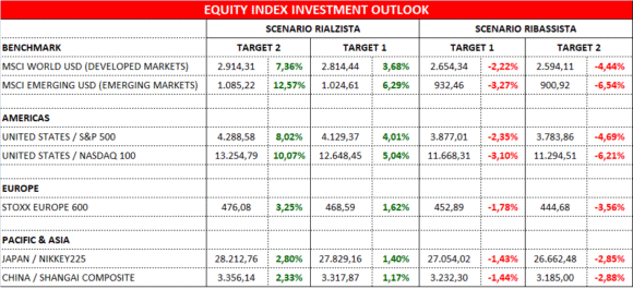 Le attuali quotazioni dell’indice MSCI World Usd gravitano ancora al di sotto dei massimi annuali e, beneficiando dell’ultimo importante rialzo settimanale, si pongono a poco più di tre punti percentuali dall’eventuale raggiungimento di area 2.854 (massimo del 2023). Prioritario a quest’ultimo, però, è la tenuta della soglia di prezzo (oggi a 2.687 punti) coincidente al transito della media mobile a cinquanta osservazioni settimanali. Nel brevissimo termine è plausibile assistere a una potenziale continuazione del trend delle ultime giornate con principale obiettivo a quota 2.814,44 (primo target mensile rialzista). Difficile, in base ai recenti scambi, ipotizzare una prosecuzione maggiormente significativa poiché l’intero palinsesto algoritmico non appare completamente orientato al buy signal. Da sottolineare la rilevanza di un eventuale raggiungimento e violazione dell’obiettivo mensile ribassista a 2.654,34 punti che, concretamente, verrebbe interpretato come sinonimo di violazione della sopracitata media mobile con implicita debolezza di fondo in ambito grafico.