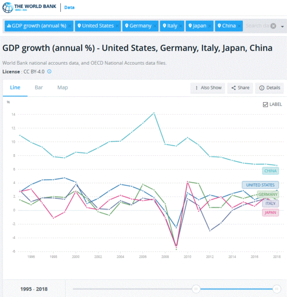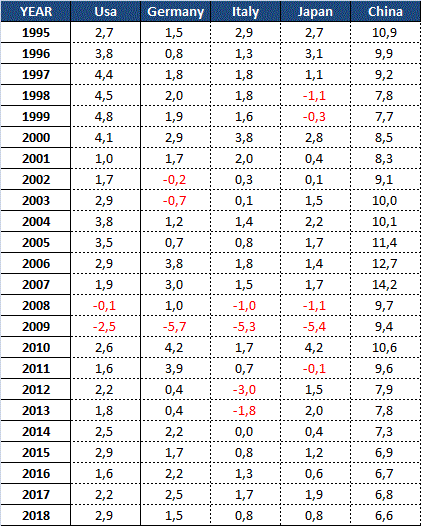 Rimanendo comunque in tema di Pil, quello che invece vogliamo sottoporre alla vostra attenzione, è quanto accaduto in situazioni di significativa crisi economica/finanziaria mondiale (circoscrivendo volutamente l’analisi al solo periodo 2008/2009): utilizzando le serie storiche “World Bank national accounts data, and OECD National Accounts data files” della Banca mondiale riconducibili a Usa, Giappone, Cina, Germania e Italia, si può – oggettivamente – valutare quale sia stato il successivo andamento nei successivi anni.