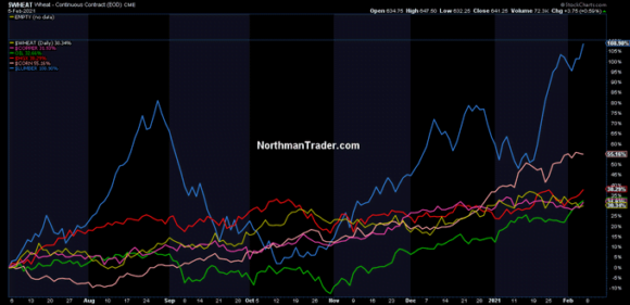 Ora, piccolo problemino: una cosa è operare su GameStop, titolo abituato a veleggiare nel range 10-20 dollari per azione e le cui montagne russe senza precedenti alla fine hanno avuto come conseguenza soltanto la “razionalizzazione” forzata del portfolio da kamikaze ribassista del Melvin Capital. Altro è lanciare l’amo per un potenziale afflusso di massa dei daily traders sul mercato futures di Bitcoin, di fatto un invito allo scontro reale e titanico fra dumb money e smart money, la quale nel frattempo sta investendo strategicamente e strutturalmente sulla criptovaluta. In quel caso, il contagio di mercato sarebbe garantito. E devastante. Il problema, poi, si pone alla luce di questo quarto e ultimo grafico, il quale ci mostra come – nonostante le patetiche negazioni di Jerome Powell e Janet Yellen – oggi il comparto delle commodities viaggi su base di incremento delle valutazioni da inizio anno del 25%.