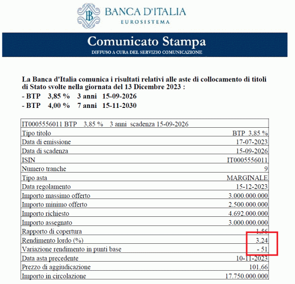 Proseguendo con ordine, nella giornata di martedì, abbiamo assistito al collocamento di 7,5 miliardi di Bot annuali con scadenza 13 dicembre 2024 caratterizzati da un rendimento del 3,528% ossia in calo di 33 centesimi rispetto a un mese fa. Anche ieri, due specifiche emissioni per un controvalore emesso di ulteriori 6 miliardi hanno registrato nella rispettive aste un significativo calo: 3 miliardi di Btp triennali (scadenza 15.09.2026) al 3,24% ovvero in flessione di oltre mezzo punto (51 centesimi). Altri 3 miliardi, sempre di Btp, ma con scadenza a 7 anni e beneficiari di un ritorno del 3,63% zavorrato da una variazione negativa dello 0,44%. Complessivamente, in soli due giorni, le casse italiane hanno risparmiato una media di poco inferiore al mezzo punto percentuale alla voce interessi passivi. Tenuto conto del tempo (48 ore) e dell’ammontare in gioco, ci troviamo di fronte a un vero e proprio affare. Per lo Stato.