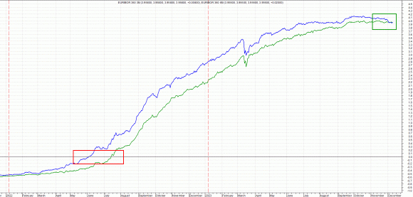 Le indicazioni che provengono dall’osservazione degli indici Euribor a 3 e 6 mesi sono eloquenti: il primo staziona in una fase di continua lateralità confinata a quota 3,90%, il secondo, distinguendosi, ha invertito la propria rotta ritracciando anch’esso a tali valori, ma, provenendo da precedenti massimi ampiamente al di sopra dei quattro punti percentuali.