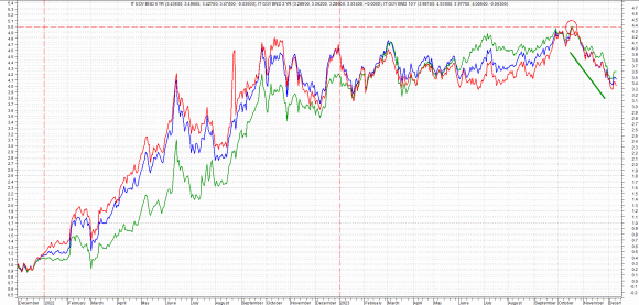 Guardando oltre e focalizzando l’attenzione alle rispettive curve sulle principali scadenze (2, 5 e 10 anni) risulta evidente la recente dinamica ribassista: ciascun rendimento lascia mediamente alle proprie spalle i massimi dello scorso ottobre ben oltre il 4%, mentre oggi si vedono variazioni percentuali nell’ordine del 3,2% (due anni), del 3,40% (cinque anni) e inferiori ai quattro punti percentuali per la scadenza decennale con quest’ultima reduce da un 4,98% di due mesi fa.