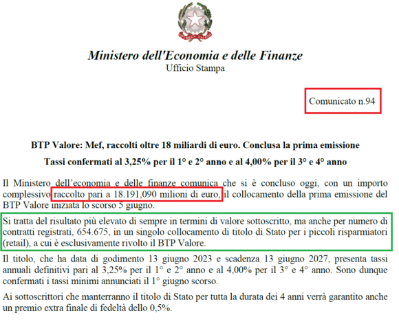 Il comunicato n. 94 a firma del ministero dell’Economia e delle Finanze parla molto chiaro anche, anzi no, meglio dire soprattutto, a quella parte degli italiani sempre scettici e conflittuali contro “lo Stato”. Leggiamo: «Si è concluso oggi, con un importo complessivo raccolto pari a 18.191,090 milioni di euro, il collocamento della prima emissione del Btp Valore iniziata lo scorso 5 giugno».