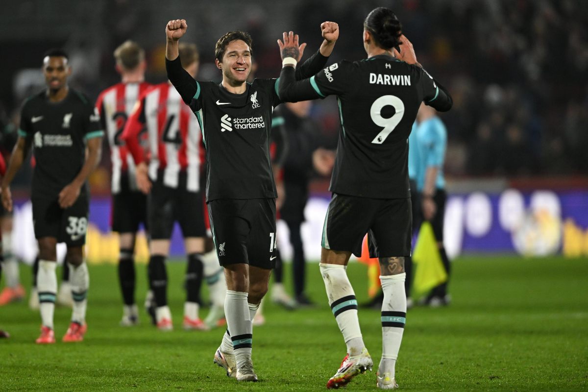 Chiesa esulta con Darwin Nunez dopo un match del Liverpool (Foto Ansa)