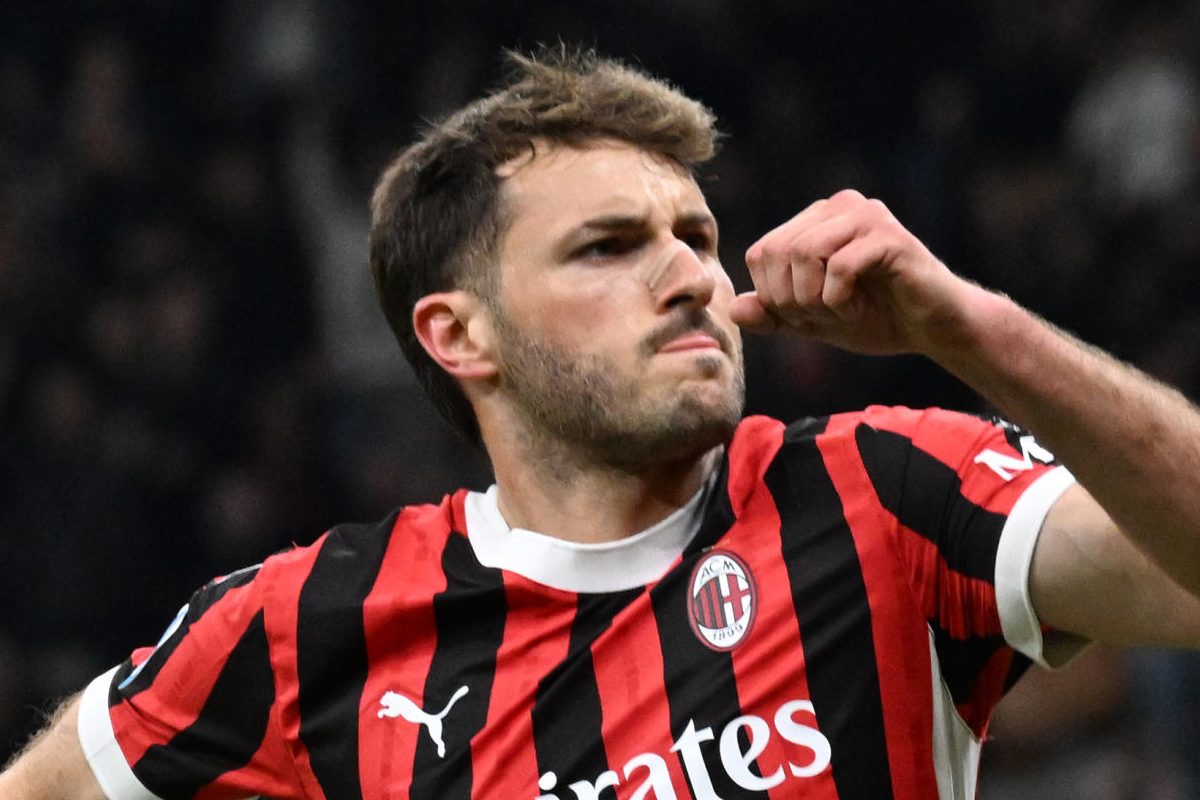 Santiago Gimenez esulta dopo il gol il Milan-Bologna (Foto Ansa)
