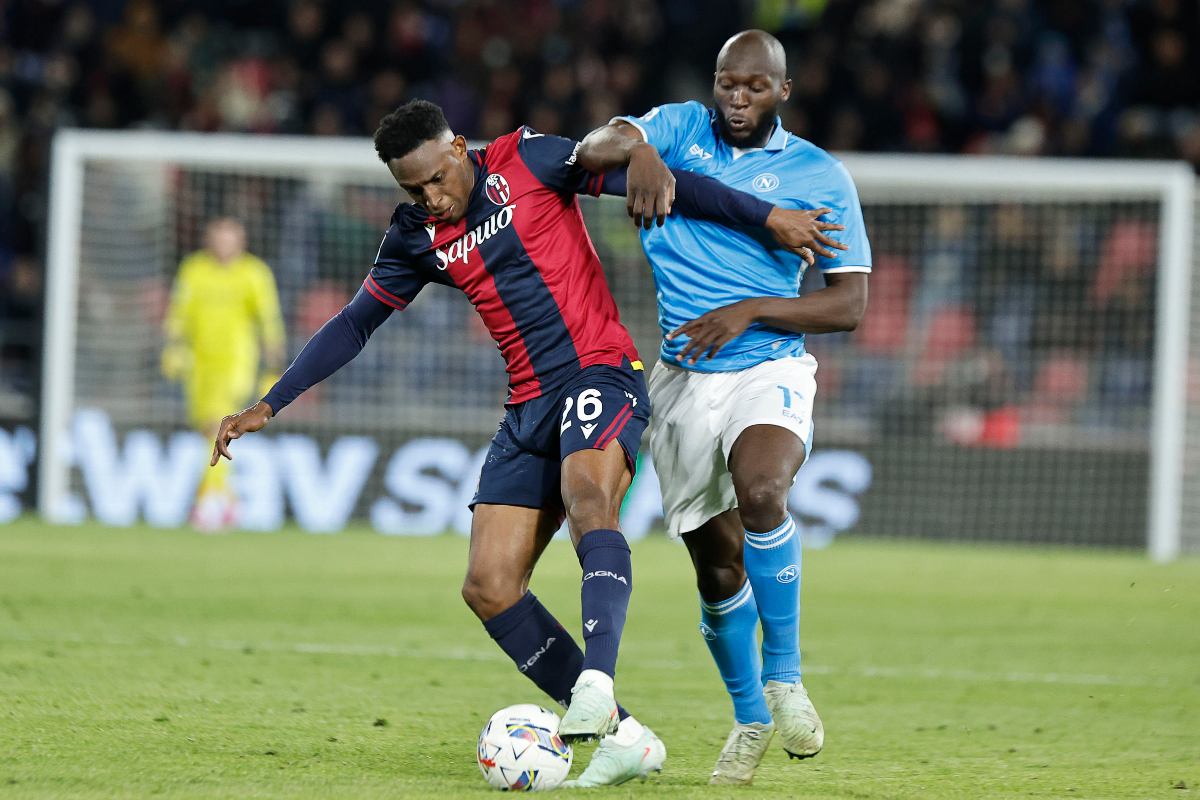 Lucumì del Bologna lotta con Lukaku del Napoli (Foto Ansa)