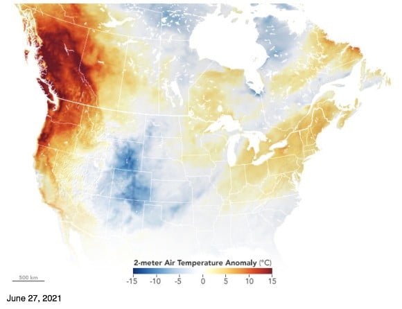 Inoltre, l’aria proveniente dall’entroterra si è riscaldata ancora di più discendendo dalle Cascade Mountains e spingendosi verso ovest. In buona sostanza, è mutata la normale circolazione dell’aria nell’area e l’oceano ha potuto fare ben poco con le sue fresche correnti.