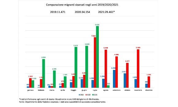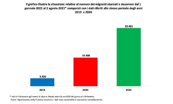 “Non puoi multare gli italiani e far sbarcare tutti. Ne ho parlato con Draghi, lo stesso Draghi è perfettamente consapevole che non si può mantenere questo ritmo di sbarchi” ha detto ieri Matteo Salvini. Il leader della Lega teme un allentamento della vigilanza sul dossier migratorio, uno dei punti qualificanti delle politiche del Carroccio. Secondo il cruscotto statistico del Viminale, il 2021 fa registrare un aumento rilevante degli arrivi rispetto ai due anni precedenti: 29.461 arrivi nel periodo 1° gennaio-2 agosto 2021, contro i 14.406 dello stesso periodo 2020 e i 3.920 del 2019 (fig. 1). Nettamente in testa il 2021 anche negli arrivi su base mensile (fig. 2).
